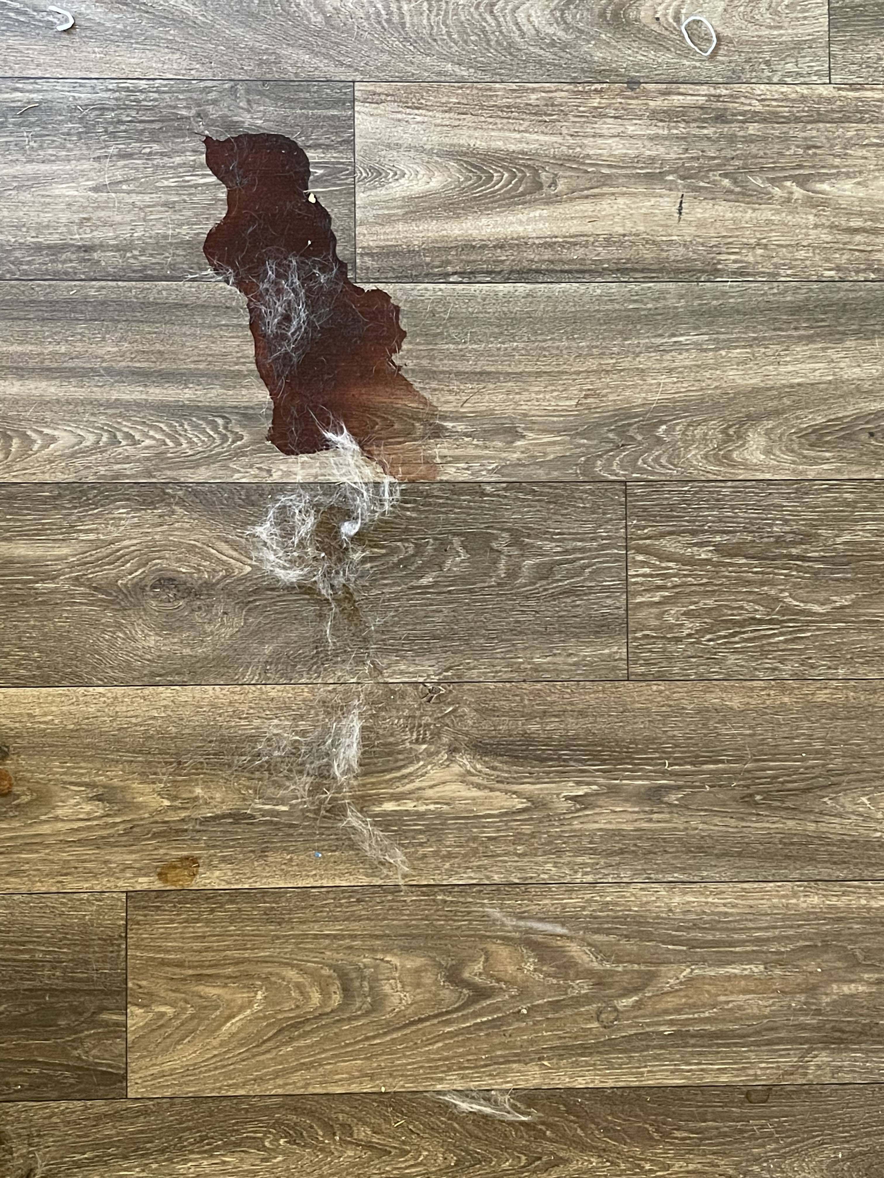 Let me walk you through what you’re seeing. I didn’t know what it was at first, either. This stain with a fur accent was directly underneath the chaise section of Hugh’s couch.